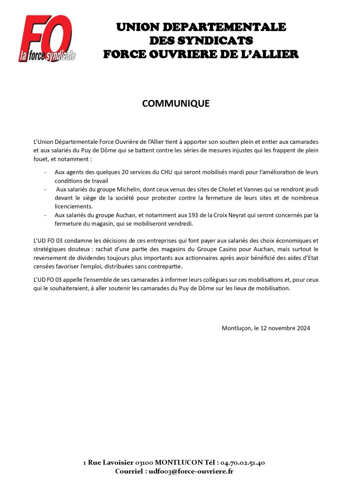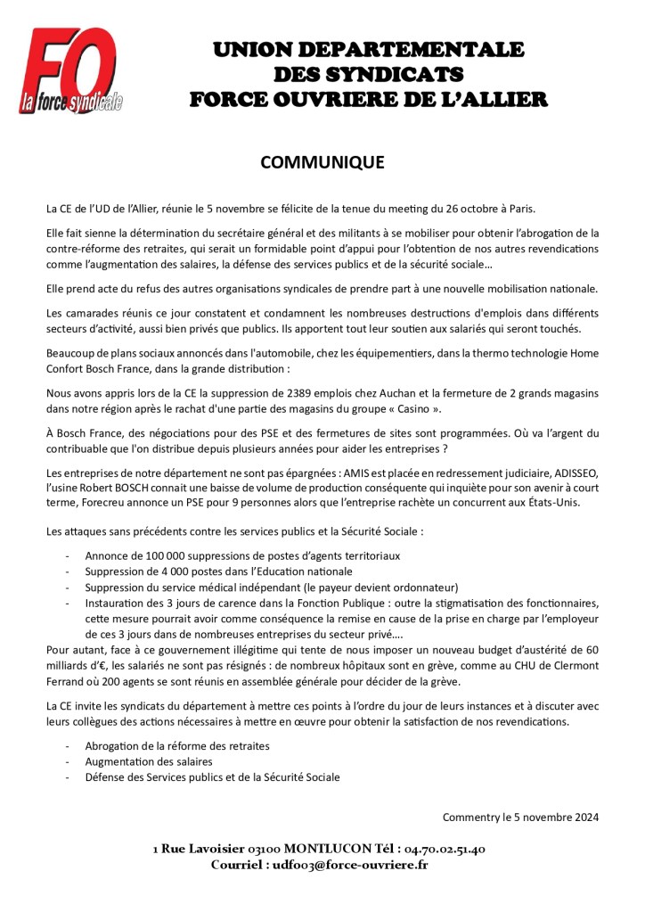 Communiqué FO Allier 03- 12 Novembre 2024